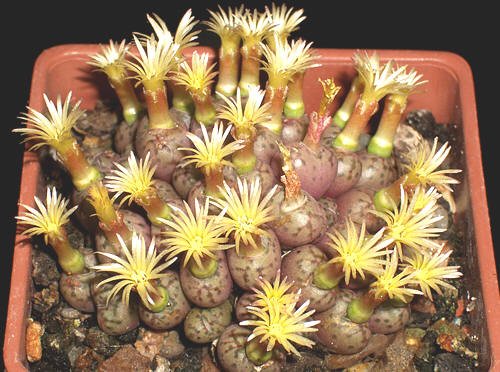 This is a widespread and very variable species, such that one wonders whether only one species is involved. On the Knersvlakte one can find small nicely-marked plants on a hillside and large unmarked specimens in the quartz at the base. Some of the smallest and best marked plants can be found in the Kliprand area and the photo shows one such plant opening its flowers in the evening.